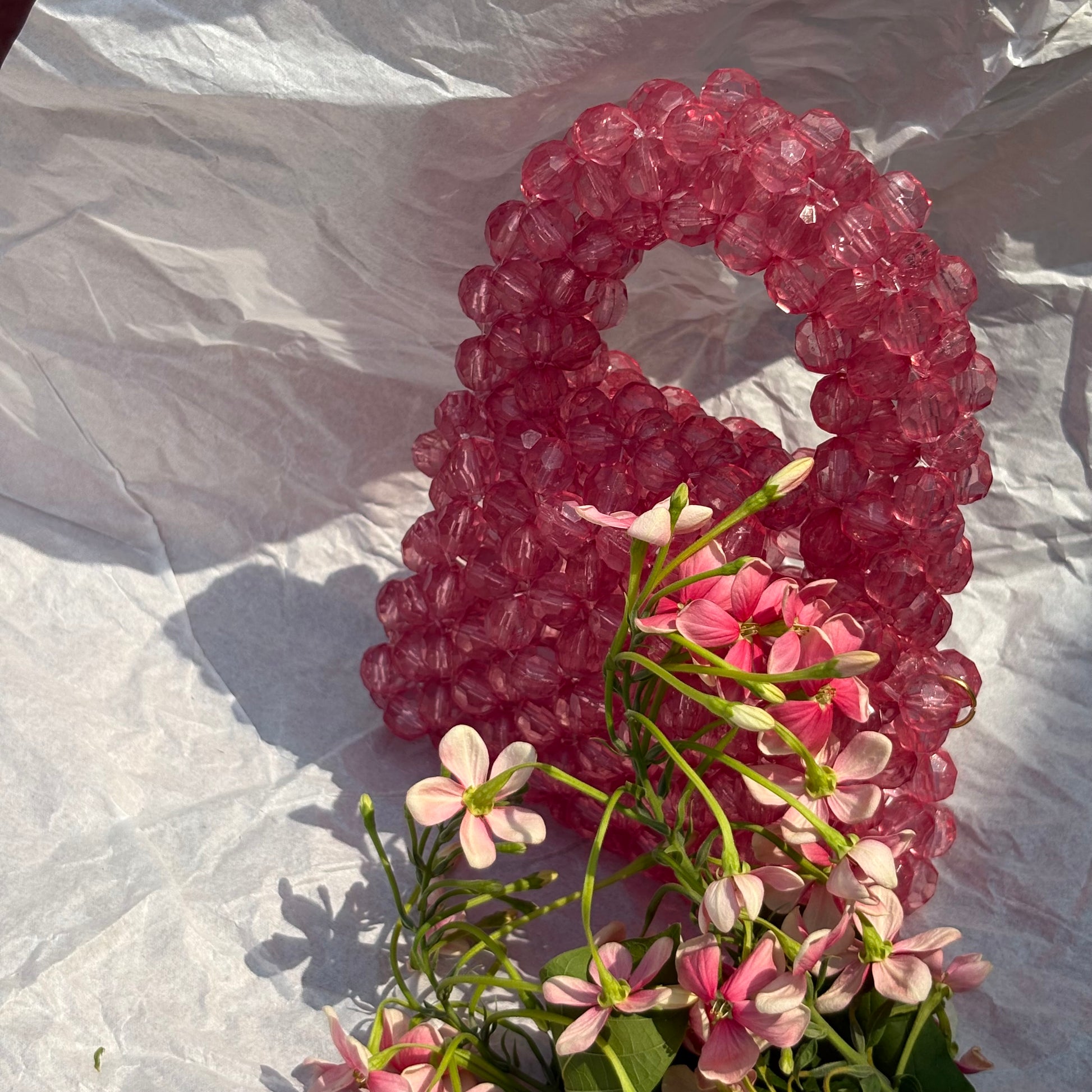 Gulabo Beaded Mini Tote is delicately handcrafted with translucent pink beads, reminiscent of blooming summer flowers. Its structured form and playful sparkle make it perfect for brunches, garden parties, or simply adding a pop of joy to your outfit. Carry your essentials in style with this bold and beautiful mini.